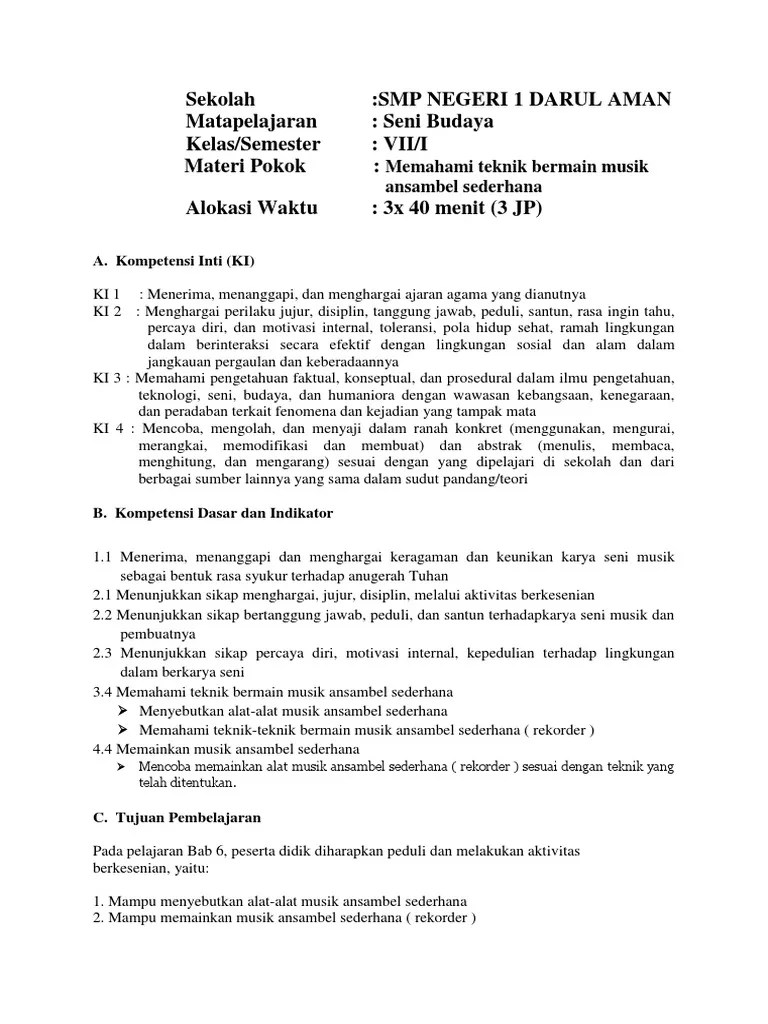 Lengkap rpp 1 lembar berdasarkan pertemuan dan penilaian tingkat smp/mts mapel seni budaya kelas 7 semester ganjil kurikulum 2013 tahun .